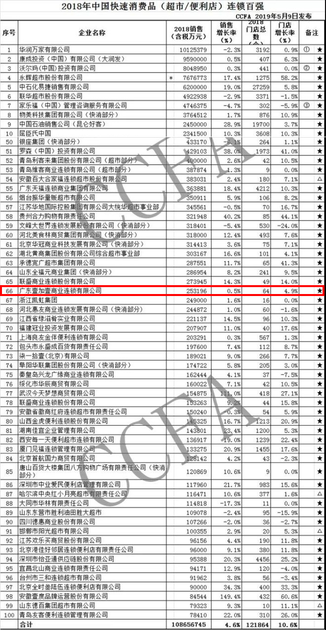 5月9日,中國(guó)連鎖經(jīng)營(yíng)協(xié)會(huì)(CCFA)發(fā)布“2018年中國(guó)快消品連鎖百?gòu)?qiáng)”榜單,廣東壹加壹商業(yè)連鎖有限公司榮膺中國(guó)快消品連鎖百?gòu)?qiáng)第66位。此前,壹加壹憑借多年來(lái)的企業(yè)發(fā)展穩(wěn)健表現(xiàn),已連續(xù)多年上榜“中國(guó)快消品連鎖百?gòu)?qiáng)”。壹加壹將以此定位奮斗的目標(biāo),爭(zhēng)取來(lái)年更進(jìn)一步。